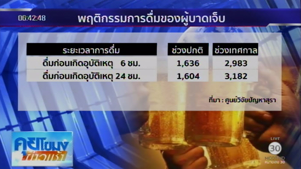 จากการสุ่มเก็บสถิติในโรงพยาบาล 32 แห่ง โดยศูนย์วิจัยปัญหาสุรา กระทรวงสาธารณสุข ในช่วงวันหยุดยาวปีใหม่และสงกรานต์ปีนี้ เพื่อเปรียบเทียบกับช่วงปกติ พบว่ามีผู้ประสบอุบัติเหตุเข้ารับการรักษาเพิ่มขึ้น ในจำนวนนี้ยอมรับว่าดื่มเครื่องดื่มที่มีแอลกอฮอล์ก่อนเกิดเหตุภายใน 6 -24 ชั่วโมง กว่า 5,000 คน และยังพบว่าการดื่มแอลกอฮอล์มีโอกาสเกิดอุบัติเหตุได้มากกว่าถึง 2 เท่า