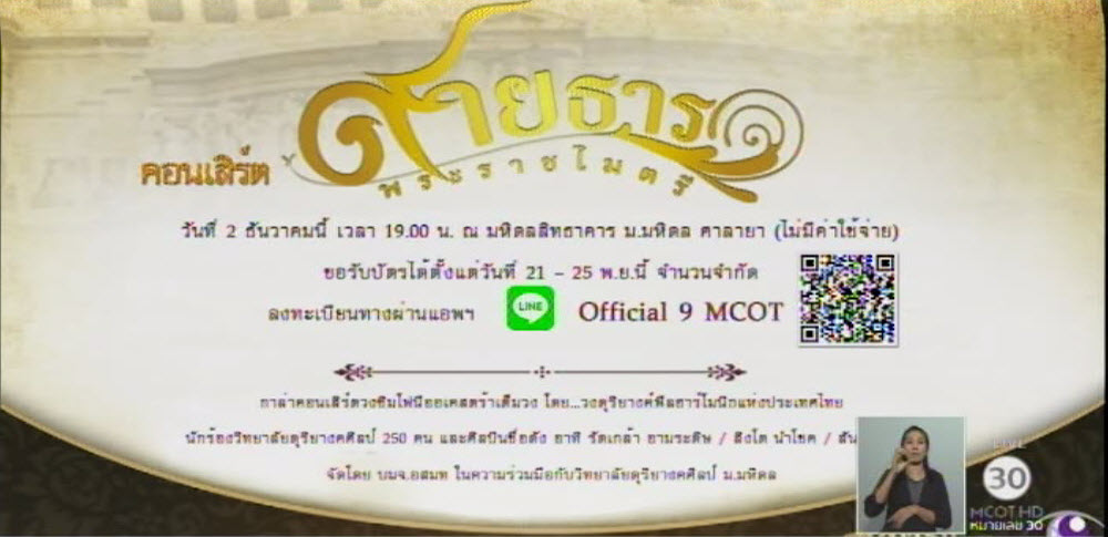 บริษัท อสมท จำกัด (มหาชน) ในความร่วมมือกับวิทยาลัยดุริยางคศิลป์ มหาวิทยาลัยมหิดล และวงดุริยางค์ฟีลฮาร์โมนิกแห่งประเทศไทย (TPO) จัดคอนเสิร์ต “สายธารพระราชไมตรี” ณ หอแสดงดนตรีมหิดลสิทธาคาร มหาวิทยาลัยมหิดล ศาลายา