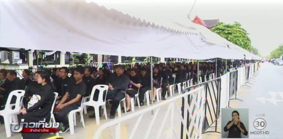 กทม. 21 พ.ย. – ตลอดช่วงเช้าวันนี้ มีประชาชนจากทุกสารทิศยังคงทยอยเดินทางมากราบถวายบังคมพระบรมศพอย่างต่อเนื่อง และแถวยาวเช่นทุกวันที่ผ่านมา แต่เจ้าหน้าที่ก็สามารถจัดคิวได้ดีขึ้นและเป็นระเบียบมากขึ้น แต่ท้ายแถวยังค่อนข้างยาว อยู่บริเวณทิศใต้ของสนามหลวง หน้าพระบรมมหาราชวัง โดยเจ้าหน้าที่จัดให้ประชาชนเดินวนผ่านไปหน้าศาลฎีกา ไปพักคอยในเต็นท์กลางสนามหลวงฝั่งทิศเหนือ ก่อนจะเดินแถวมาเพื่อเข้าสู่พระบรมมหาราชวังทางฝั่งประตูมณีนพรัตน์ โดยระหว่างรอ หากต้องการไปเข้าห้องน้ำ จะต้องรับใบลาคิวจากเจ้าหน้าที่ที่หน้าเต็นท์ เพื่อแสดงตัวก่อนเข้ากลับแถว เพื่อป้องกันการแทรกคิว