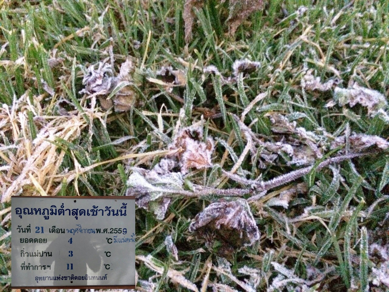 เชียงใหม่ 21 พ.ย.- เชียงใหม่เกิดน้ำค้างแข็งเป็นครั้งแรกของฤดูหนาวปียอดดอยอินทนนท์ นักท่องเที่ยวประทับใจได้เห็นเร็ว อุตุฯ คาดปีนี้หนาวนานอาจเกิดปรากฏการณ์บ่อย
