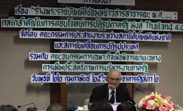 นายมีชัย ฤชุพันธุ์ ประธานกรรมการร่างรัฐธรรมนูญ (กรธ.) ปาฐกถาพิเศษเรื่อง “เจตนารมณ์ของรัฐธรรมนูญในการเปิดเผยข้อมูลข่าวสารสาธารณะ” ในเวทีเสวนาเรื่อง “ร่างพระราชบัญญัติข้อมูลข่าวสารสาธารณะ พ.ศ. :กลไกสำคัญในการตอบโจทย์การปฏิรูปภาครัฐ มุ่งสู่ Thailand 4.0” ที่คณะกรรมการประสานงานระหว่างสภานิติบัญญัติแห่งชาติ และสภาขับเคลื่อนการปฏิรูปประเทศ ร่วมกับ คณะอนุกรรมาการเฉพาะกิจเพื่อพิจารณาแนวทางการเพิ่มประสิทธิภาพการบริหารงานภาครัฐ จัดขึ้น