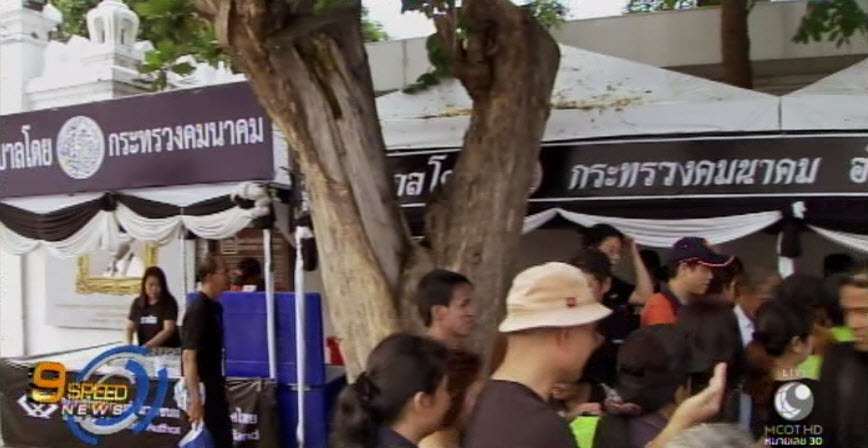 นายอาคม เติมพิทยาไพสิฐ รัฐมนตรีคมนาคม ตรวจความเรียบร้อยเต็นท์ของกระทรวงคมนาคม บริเวณหน้ามหาวิทยาลัยศิลปากร พร้อมแจกร่ม พัด ลูกอม ขนม และยาหม่องให้กับประชาชนที่เดินทางมากราบถวายบังคมพระบรมศพ พระบาทสมเด็จพระปรมินทรมหาภูมิพลอดุลยเดช ภายในพระบรมมหาราชวัง รัฐมนตรีคมนาคมย้ำห้ามรถเมล์ควันดำวิ่งรอบท้องสนามหลวงอย่างเด็ดขาด หากตรวจพบจะสั่งให้ไปตรวจสภาพใหม่ พร้อมนำรถเมล์ในเส้นทางปกติมาให้บริการเสริมที่ท้องสนามหลวงในวันที่มีประชาชนมาจำนวนมาก. -สำนักข่าวไทย