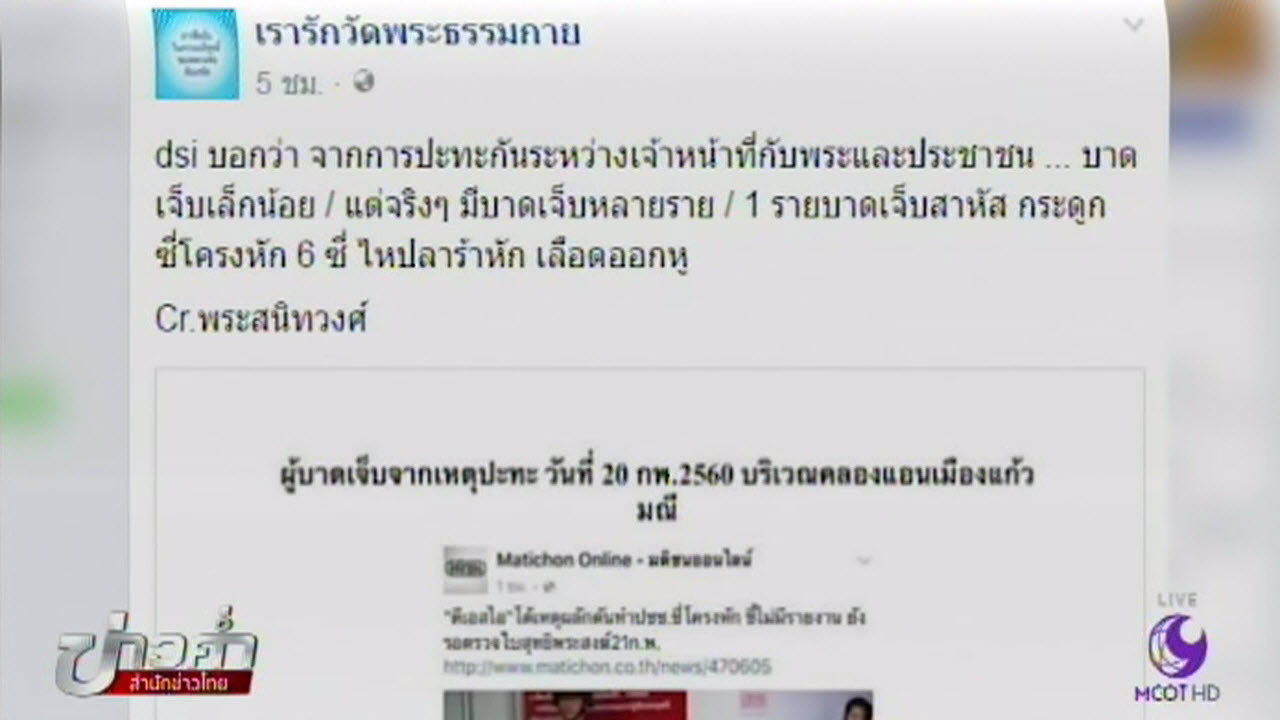 วันนี้หน้าเฟชบุ๊กที่ใช้ชื่อว่า “เรารักพระธรรมกาย” มีการโพสต์ภาพกลุ่มบุคคลแต่งกายคล้ายเจ้าหน้าที่และประชาชน พร้อมข้อความกล่าวหาเจ้าหน้าที่ นอกจากนี้ ยังมีการแชร์ภาพเดียวกันมาจากเพจ ที่ชื่อว่า “พระนพดล สิริวังโส” แต่ข้อความในภาพต่างกัน รวมทั้งยังมีการโพสต์ภาพพร้อมข้อความระบุในทำนองว่า มีผู้บาดเจ็บจากเหตุเผชิญหน้ามากกว่าที่ดีเอสไอระบุ