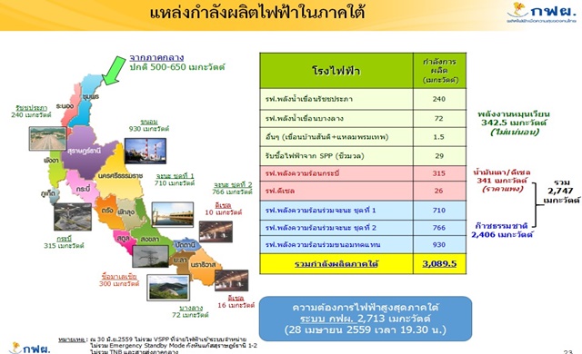 “ตอนนี้ทั้งการก่อสร้างสายส่งและโรงไฟฟ้าภาคใต้ มีผู้คัดค้าน หากช้าทั้ง2 เด้งก็นับมีความเสี่ยงมาก หากต้องอาศัยสายส่งเดิมเท่านั้น ต้องระมัดระวังเป็นที่สุด หากเกิดสิ่งไม่คาดฝัน เหมือนปี 2556 ไฟฟ้าก็อาจจะเกิดปัญหาดับ14 จังหวัดภาคใต้ ทางแก้อื่น อาจต้องซื้อไฟฟ้าจากมาเลเซียเพิ่มขึ้น ปัญหาคือราคาแพงตั้งแต่กว่า 2 บาทจนถึง8 ต่อหน่วยและจำกัดเพียง 300 เมกะวัตต์ เท่านั้น”นายสหรัฐกล่าว