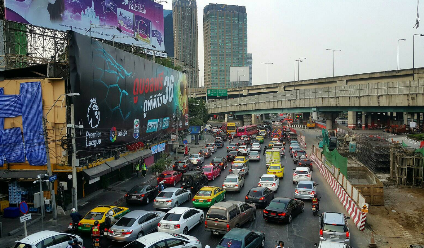 ถนนกรุงธนบุรี มุ่งหน้าสะพานสมเด็จพระเจ้าตากสิน รถมาก ท้ายสะสมบีทีเอส วงเวียนใหญ่