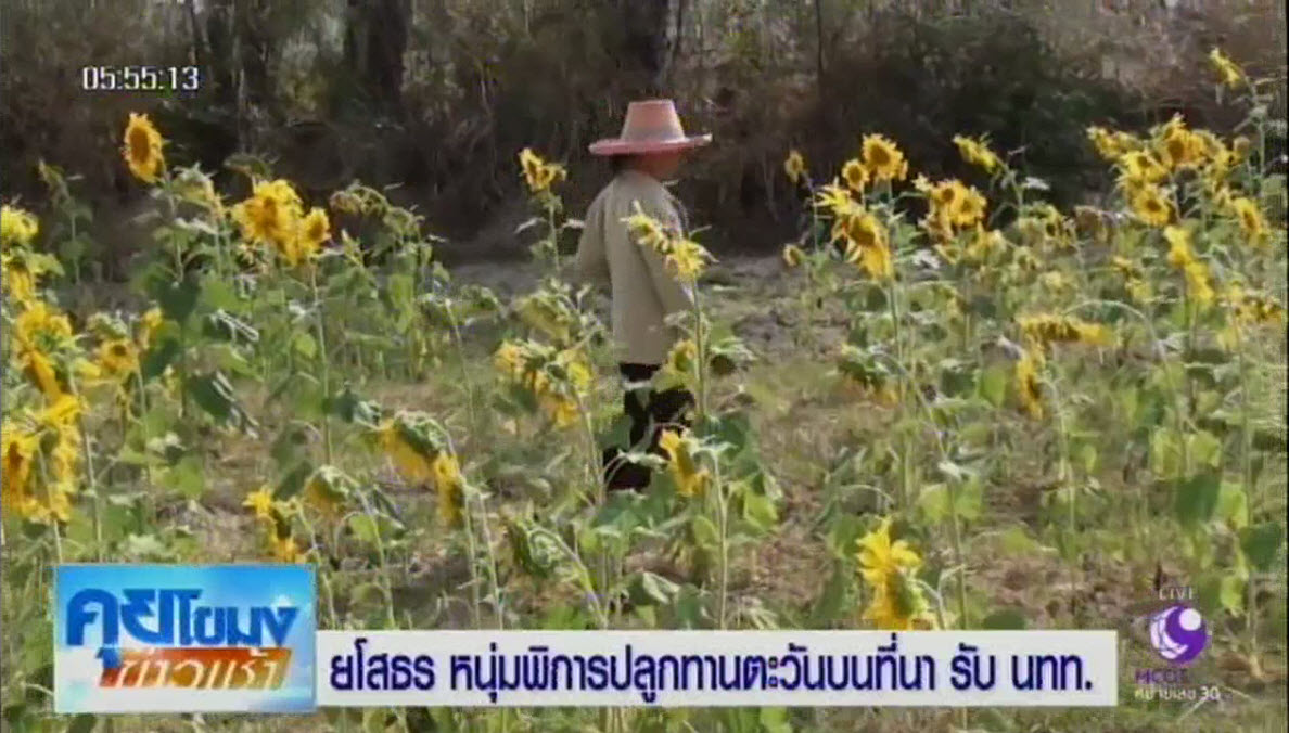 ยโสธร 6 มี.ค.-หนุ่มพิการใจสู้ พาแม่ปลูกทานตะวันบนที่นากว่า 13 ไร่ ใน จ.ยโสธร รับนักท่องเที่ยวช่วงหน้าแล้ง แม้ไม่มีแหล่งน้ำธรรมชาติและระบบชลประทาน ยังดัดแปลงนำรถจักรยานเก่าและกังหันลมปั่นสูบน้ำจากบ่อบาดาล หารายได้ก่อนเข้าสู่ฤดูการทำนา