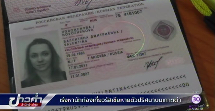 สำหรับนางสาววาเลนติน่า เดินทางโดยสายการบินจากกรุงมอสโก เข้ามาไทย เมื่อวันที่ 7 กุมภาพันธ์ ก่อนจะมาหายตัวที่เกาะเต่าในคืนวันที่ 15 กุมภาพันธ์ โดยนางสาววาเลนติน่า สูง 170 เซนติเมตร ผมสีน้ำตาลอ่อน ข้อมือด้านซ้ายมีรอยสักคล้ายตัวอักษร V หากใครพบหรือมีข้อมูลสามารถโทรแจ้งเบาะแสได้ที่ สภ.เกาะเต่า หรือ โทร 077-456-098. -สำนักข่าวไทย