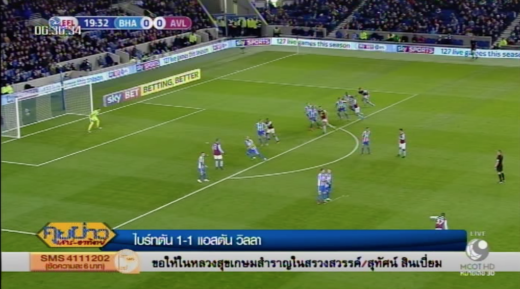 เกมอีเอฟแอล แชมเปียนชิพ นัดที่ 13 ของฤดูกาล คู่ที่ช่อง 9 MCOT HD หมายเลข 30 ถ่ายทอดสด ไบรท์ตัน แอนด์ โฮฟ อัลเบียน เปิดบ้านพบกับ แอสตัน วิลล่า เกมนี้ทีมเยือนวิลล่า ขึ้นนำก่อน 1-0 จาก Nathan Baker นาทีที่ 20 แต่เจ้าบ้าน ไบรท์ตัน ตามตีเสมอได้จาก Glenn Murray นาทีที่ 45 จบเกมแบ่งไปทีมละ 1 คะแนน ไบรท์ตัน แอนด์ โฮฟ อัลเบียน มีเพิ่มเป็น 35 คะแนน จาก 17 นัด ยังรั้งรองจ่าฝูงเช่นเดิม ส่วนแอสตัน วิลล่า มี 22 คะแนน จาก 17 นัด อยู่อันดับ 13