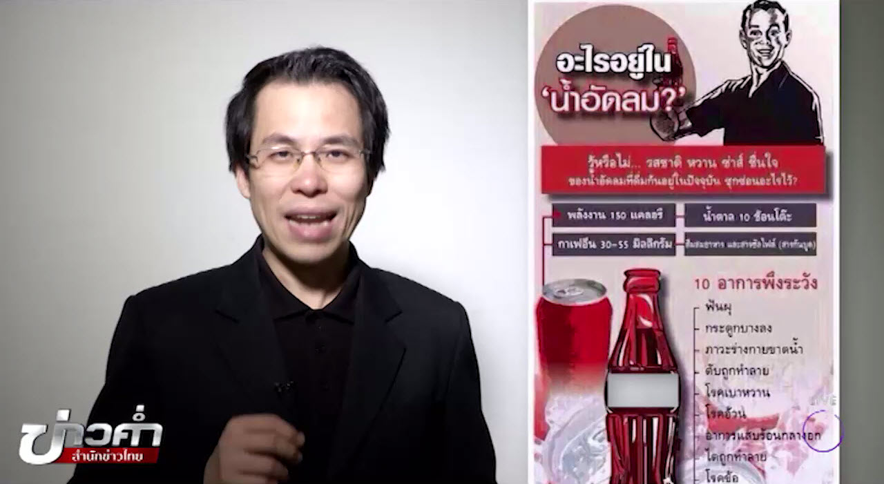 ศูนย์ชัวร์ก่อนแชร์ สำนักข่าวไทย ตรวจสอบกับ ดร.สืบพงษ์ กองวชิรพันธ์ นักวิจัยสถาบันโภชนาการ มหาวิทยาลัยมหิดล อธิบายว่าน้ำอัดลมประกอบด้วยน้ำ น้ำตาล คาร์บอนไดออกไซด์ มีการแต่งสี กลิ่น รส รวมถึงใส่สารกันเสียเล็กน้อย สิ่งที่ควรระวังคือปริมาณน้ำตาลในน้ำอัดลมที่มีปริมาณเกิน 6 ช้อนชา เกินความต้องการที่องค์การอนามัยโลกแนะนำว่าไม่ควรบริโภคต่อวันเกิน 6 ช้อนชา ซึ่งหมายถึงน้ำตาลที่อยู่ในอาหารและผลไม้ทุกชนิด พร้อมแนะนำว่าหากดื่มน้ำอัดลม 1 แก้ว หรือ 1 กระป๋องต่อวันแล้ว ควรกินอาหารอื่นๆ ที่ไม่หวานเกินไป และเพิ่มการออกกำลังกาย