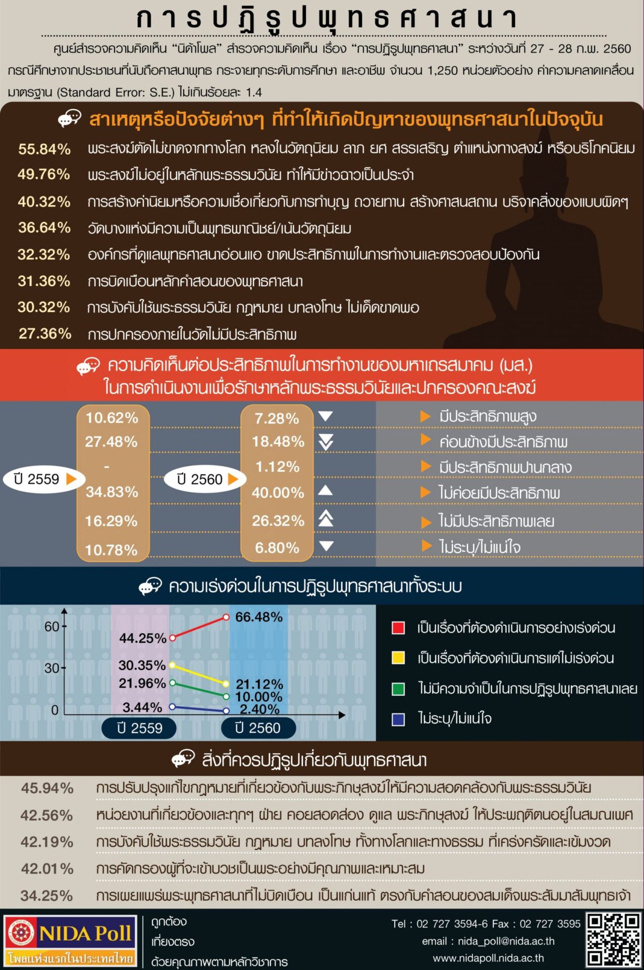 ศูนย์สำรวจความคิดเห็น “นิด้าโพล” สถาบันบัณฑิตพัฒนบริหารศาสตร์ (นิด้า)เปิดเผยผลสำรวจความคิดเห็นของประชาชน เรื่อง“การปฏิรูปพุทธศาสนา” ในระหว่างวันที่ 27–28 ก.พ.2560 กรณีศึกษาจากประชาชนที่ นับถือศาสนาพุทธ กระจายทุกระดับการศึกษาและอาชีพทั่วประเทศ รวมทั้งสิ้น 1,250 หน่วยตัวอย่าง