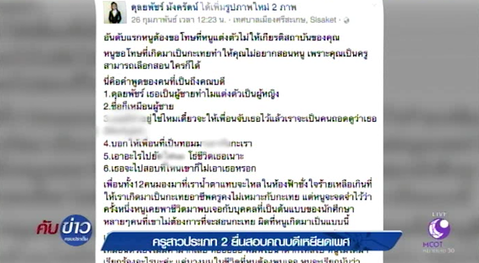 ศรีสะเกษ 1 มี.ค.-ครูสาวประเภทสอง ยื่นสอบคณบดีเหยียดเพศ ผิด พ.ร.บ.ความเท่าเทียม ลั่นภูมิใจได้ปกป้องเพศที่สาม