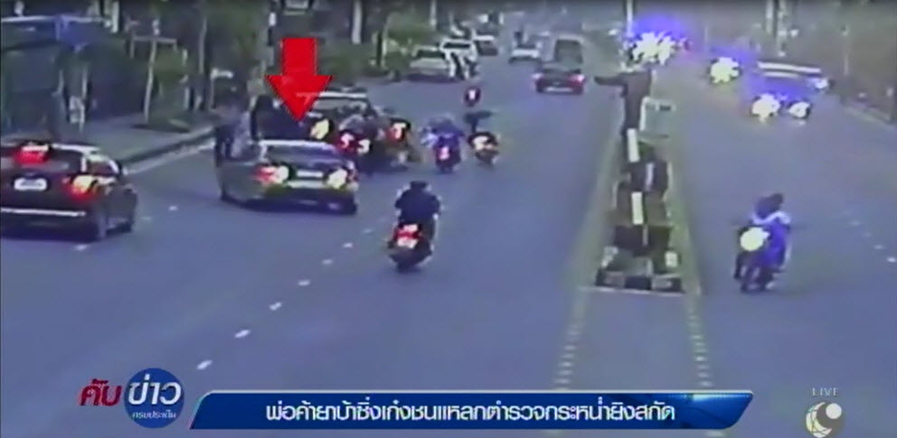 เจ้าหน้าที่ตำรวจชุดล่อซื้อพยายามวิ่งไล่ และตามไปทันบริเวณใกล้สี่แยกไฟแดง เพราะมีรถของชาวบ้านจอดขวางปิดทางติดไฟแดง เจ้าหน้าที่ตำรวจจึงใช้ปืนยิงยางล้อรถของพ่อค้ายาบ้าจนแตก แต่พ่อค้ายาบ้ารายนี้ยังไม่ลดละความพยายามที่จะหลบหนีการจับกุมของเจ้าหน้าที่ ขับรถชนท้ายรถของชาวบ้าน ก่อนที่จะขับเบียดแซงเข้าไปในช่องทาง จนสามารถขับหลบหนีไปทางชุมชนบ้านบน แต่เนื่องจากยางล้อหน้าแตก จึงขับหนีไปไม่ไกล ก่อนที่จะขับหลบหนีเข้าไปในซอย จอดรถทิ้งไว้วิ่งหลบหนีไป โดยทิ้งหญิงสาวไว้ในรถ ก่อนที่เจ้าหน้าที่ตำรวจจะไล่ตามไปทันรวบตัวหญิงสาวเอาไว้ได้พร้อมของกลางยาบ้า 10 เม็ด