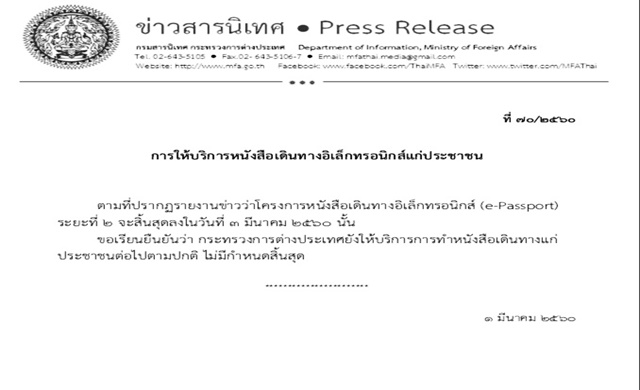 กรุงเทพฯ 1มี.ค.-กระทรวงต่างประเทศยืนยันให้บริการประชาชนทำหนังสือเดินทางอิเล็กทรอนิกส์ต่อ ยังไม่มีกำหนดสิ้นสุด