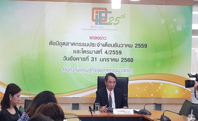 นายวีรศักดิ์ ศุภประเสริฐ รองผู้อำนวยการสำนักงานเศรษฐกิจอุตสาหกรรม (สศอ.) เปิดเผยว่า ดัชนีผลผลิตอุตสาหกรรม (MPI) ในเดือนแรกของปี 2560 ยังคงขยายตัวอย่างต่อเนื่องอยู่ที่ร้อยละ 3.1 เมื่อเทียบจากเดือนธันวาคมที่ผ่านมา และขยายตัวที่ร้อยละ 1.3 เมื่อเทียบกับช่วงเดียวกันในปีก่อน โดยอุตสาหกรรมสำคัญที่ส่งผลบวก ได้แก่ ชิ้นส่วนอิเล็กทรอนิกส์ เหล็กและผลิตภัณฑ์เหล็กกล้าขั้นมูลฐาน ผลิตภัณฑ์ทางเภสัชกรรม รถยนต์ และผลิตภัณฑ์เบเกอรี่