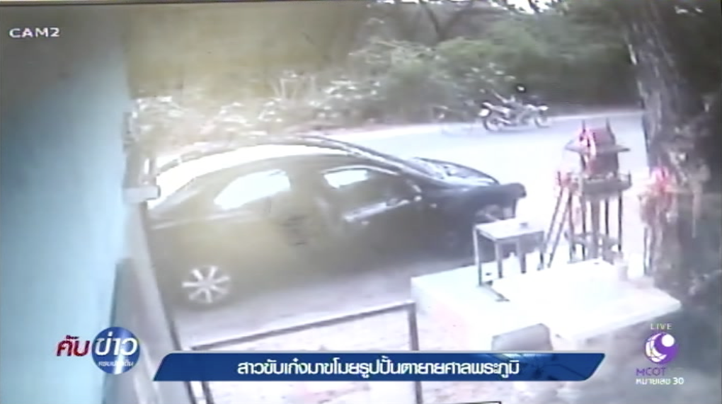 อยุธยา 27 ก.พ.-กล้องวงจรปิดจับภาพสาวขับเก๋งขโมยรูปปั้นตายายศาลพระภูมิ ชาวบ้านคาดจุดประสงค์ของผู้ก่อเหตุมาจากเรื่องของความเชื่อ
