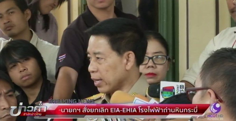 กรุงเทพฯ 27 ก.พ.-นายกรัฐมนตรี สั่งยกเลิก EIA และ EHIA โรงไฟฟ้าถ่านหินกระบี่แล้ว เหตุห่วงกระบวนการมีส่วนร่วมของประชาชน