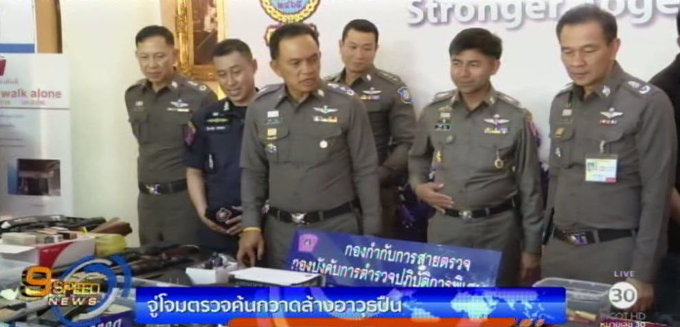 กทม. 18 พ.ย. – อาวุธปืน 21 กระบอก และเครื่องกระสุนกว่า 2,000 นัด คือของกลางที่ตำรวจตรวจยึดได้จากการจู่โจมตรวจค้นบ้านเป้าหมาย 42 จุด ทั่วกรุงเทพมหานคร ในรอบ 2 สัปดาห์ จับกุมผู้ต้องหาได้ 2 คน หลังสืบทราบว่าผู้ต้องหาขายอาวุธปืนผ่านเว็บไซต์ โดยเฉพาะที่บ้านนายวินัย กิ่งพยอม พนักงานการรถไฟแห่งประเทศไทย ตำแหน่งช่างเครื่องหัวจักรรถระดับ 5 พบอาวุธปืนอัดลมบีบีกัน รวมทั้งประทัดยักษ์ ชุดเก็บกู้วัตถุระเบิดจึงเข้าสแกนพื้นที่เพื่อค้นหาเชื้อปะทุ ซึ่งอาจซุกซ่อนภายในบ้าน