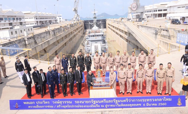 พล.อ.ประวิตร วงษ์สุวรรณ รองนายกรัฐมนตรี ฝ่ายความมั่นคงและรัฐมนตรีว่าการกระทรวงกลาโหม พร้อมพล.อ.เฉลิมชัย สิทธิสาท ผู้บัญชาการทหารบก พล.อ.อ. ทวิเดนศ(ทะ-วิ-ดะ-เนด) อังศุสิงห์ รองผู้บัญชาการทหารอากาศ และนายทหารระดับสูงของสามเหล่าทัพ ตรวจเยี่ยมหน่วยงานของกองทัพเรือ สายงานด้านการซ่อมบำรุงยุทโธปกรณ์ ที่อู่ราชนาวีมหิดลอดุลยเดช กรมอู่ทหารเรือ อ.สัตหีบ จ.ชลบุรี โดยมี พล.ร.อ.ณะ อารีนิจ ผู้บัญชาการทหารเรือ พร้อมด้วยคณะนายทหารระดับสูงของกองทัพเรือให้การต้อนรับ