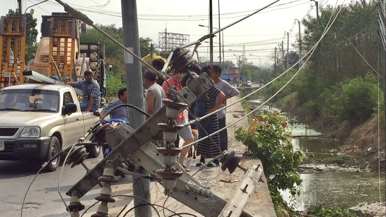 ฉะเชิงเทรา 10 มี.ค.- กฟภ.ฉะเชิงเทราเร่งซ่อมเสาไฟฟ้าล้มบริเวณทางเข้า อบต.โสธร จากเหตุรถบรรทุกรถบดถนนเกี่ยวสายเคเบิล ไฟดับเป็นวงกว้าง คาดใช้เวลาแก้ไขกว่า 6 ชั่วโมง