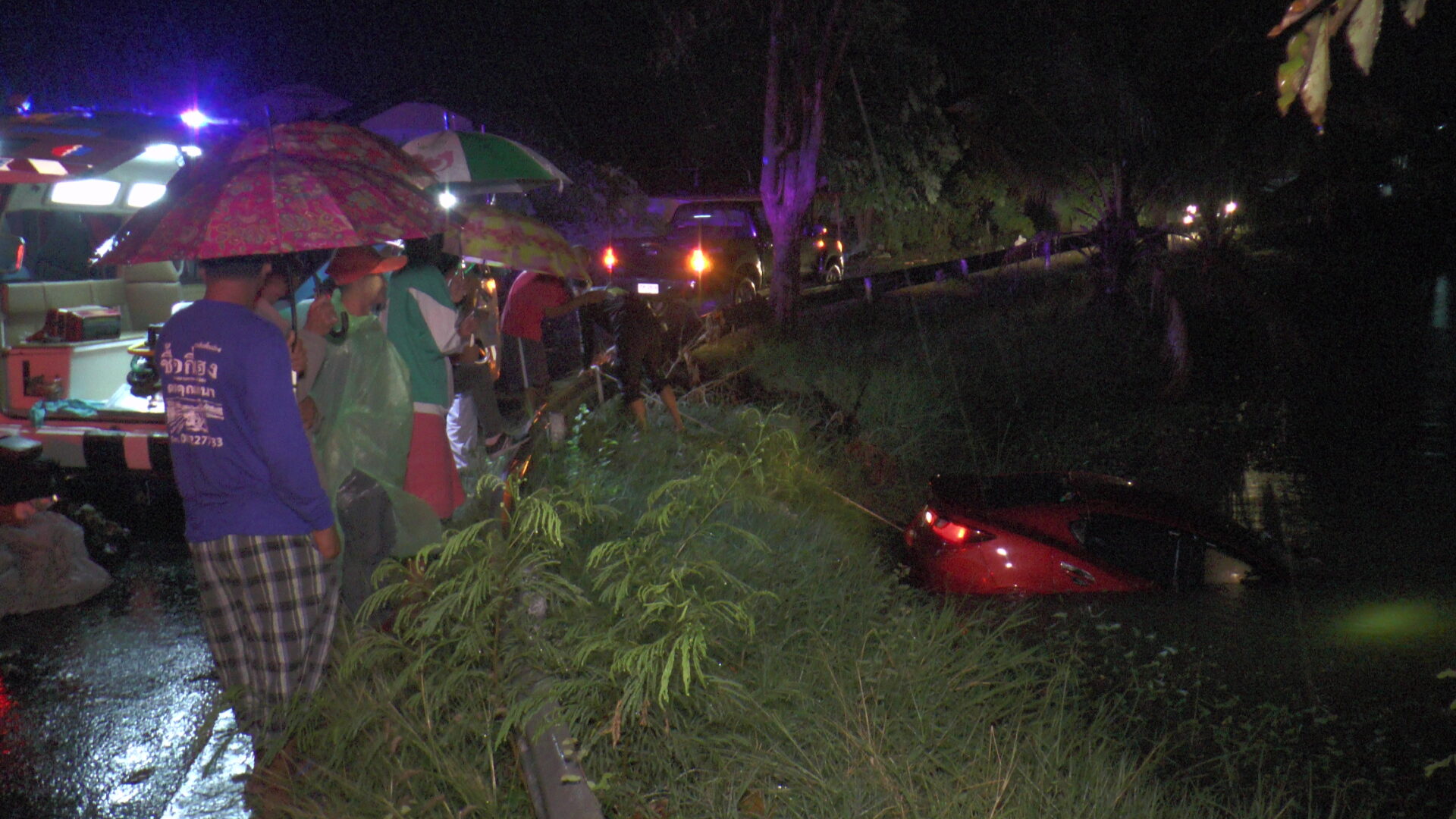 บุรีรัมย์ 10 มี.ค.- นักดนตรีหนุ่มขับรถจากชลบุรีจะไปงานแต่งเพื่อนที่บุรีรัมย์ ท่ามกลางฝนตกหนัก มองไม่เห็นเป็นทางโค้งจนรถเหินข้ามราวกั้นพุ่งตกสระน้ำ รีบตะกายออกมาได้ทันก่อนจมมิด