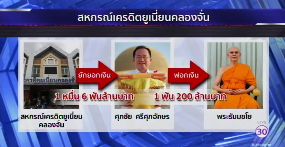 คดียักยอกทรัพย์สหกรณ์เครดิตยูเนี่ยนคลองจั่น มูลค่าความเสียหายกว่า 16,000 ล้านบาท โดยนายศุภชัย ศรีศุภอักษร ซึ่งนั่งเก้าอี้ประธานกรรมการฯ ขณะนั้น ร่วมกับพวกยักยอกเงินสมาชิกสหกรณ์ฯ ไปจ่ายให้บุคคลต่างๆ รวมทั้งพระธัมมชโย กับพวก มูลค่ากว่า 1,200 ล้านบาท คณะลูกศิษย์วัดพระธรรมกายตกลงจ่ายเงินคืนให้กับสหกรณ์ฯ และกับการถอนฟ้องพระธัมมชโย และวัดพระธรรมกาย