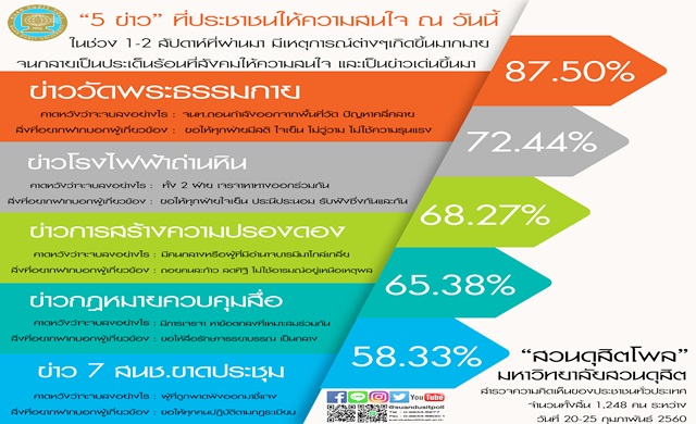 สวนดุสิตโพล มหาวิทยาลัยสวนดุสิต สำรวจความคิดเห็นประชาชนทั่วประเทศ จำนวนทั้งสิ้น 1,248 คน ระหว่างวันที่ 20-25 ก.พ.2560 หัวข้อ ‘5ข่าว’ ที่ประชาชนให้ความสนใจ ณ วันนี้ ทั้งนี้ สืบเนื่องจากในช่วง 1-2 สัปดาห์ที่ผ่านมา มีเหตุการณ์ต่างๆเกิดขึ้นมากมาย กลายเป็นประเด็นร้อนที่สังคมให้ความสนใจและเป็นข่าวเด่นขึ้นมา เพื่อเป็นการสะท้อนความคิดเห็นและเป็นข้อมูลอันเป็นประโยชน์ต่อหน่วยงานที่เกี่ยวข้องต่อไป