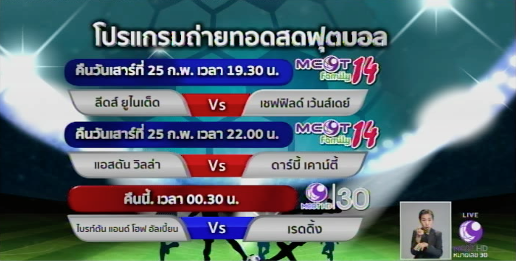 กทม. 25 ก.พ.- ช่อง 9 MCOT HD หมายเลข 30 และช่อง MCOT Family หมายเลข 14 เตรียมถ่ายทอดสดฟุตบอล EFL Championship ของอังกฤษ เต็มอิ่ม 3 คู่