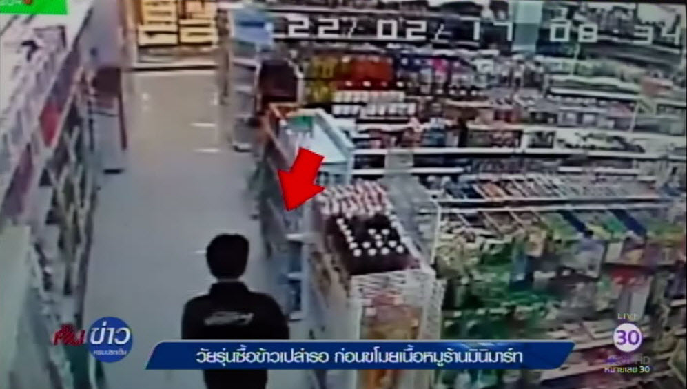 น.ส.อัญจริยา เปิดเผยว่า จากภาพวงจรปิดภายในร้านดังกล่าว เผยให้เห็นชายวัยรุ่นคนแรก ทำทีเดินเลือกซื้อของอยู่ภายในร้าน นานพอสมควร จนคิดว่าพนักงานในร้านเผลอ เดินไปที่ตู้แช่อาหารสด และหยิบเอาเนื้อหมูสดแบบแพ็กสำเร็จ น้ำหนักประมาณครึ่งกิโลกรัม ซุกไว้ในเสื้อที่ชายวัยรุ่นสวมใส่อยู่ ก่อนจะรีบเดินออกนอกร้าน แต่ขณะเดียวกันพนักงานของทางร้าน ได้ติดตามดูพฤติกรรมผ่านกล้องวงจรปิดที่ติดตั้งไว้ทั่วทั้งร้าน จึงได้เดินออกมาดักที่ประตูทางออก และขอตรวจค้น แต่ชายวัยรุ่นกลับต่อสู้ขัดขืน และสะบัดตัวหลุดวิ่งหนีขึ้นรถจักรยานยนต์ ที่มีวัยรุ่นชายหญิงอีก 2 คน ที่ไปซื้อข้าวเปล่ามาไว้รอที่รถ และติดเครื่องรออยู่ ขับขี่หลบหนีไป