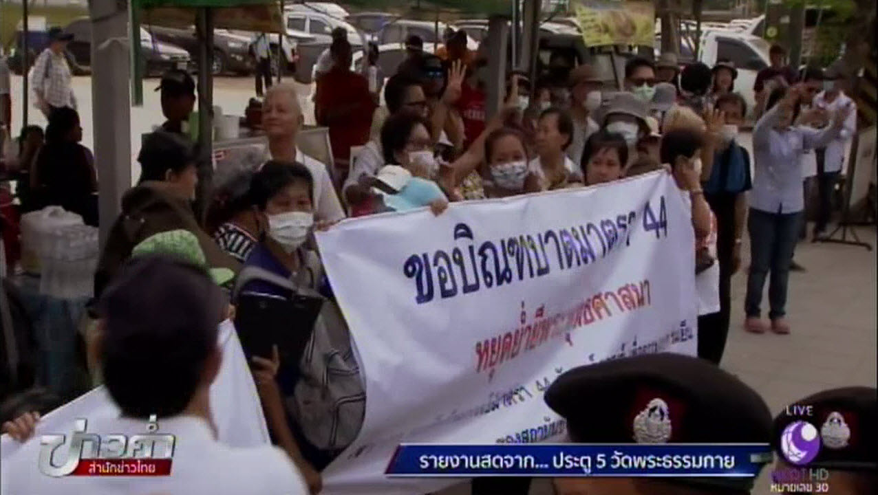 ตัวแทนพระสงฆ์ สามเณร และศิษย์วัดที่รวมตัวชุมนุมอยู่บริเวณตลาดกลางคลองหลวง ได้ออกมายืนแสดงอารยะขัดขืน และชูป้ายริมถนนคลองหลวง ด้านหน้าตลาด เรียกร้องให้รัฐบาลยกเลิกการใช้มาตรา 44 ปิดล้อมพื้นที่ เนื่องจากทำให้พระสงฆ์และลูกศิษย์ที่อยู่ภายในวัดประสบความลำบาก โดยเฉพาะเรื่องอาหารการกิน แม้เจ้าหน้าที่จะอนุญาตให้นำอาหารปรุงสุก 300 กล่อง ไปส่งผ่านทางประตู 7 แต่ก็ยังไม่เพียงพอกับจำนวนผู้ที่อยู่ด้านใน รวมทั้งการตัดสัญญาณโทรศัพท์และอินเทอร์เน็ตก็กังวลว่า จะทำให้ผู้ที่รวมตัวอยู่ด้านนอกวัดเป็นห่วงผู้อยู่ในวัดมากยิ่งขึ้น และอาจมีการฝ่าฝืนด่านตรวจเจ้าหน้าที่เข้าไปภายใน
