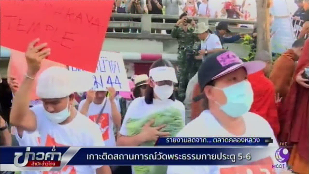 ปทุมธานี 23 ก.พ.-บรรยากาศที่ตลาดกลางคลองหลวง ตรงข้ามฝั่งประตู 5-6 วัดพระธรรมกาย หลังมีเหตุตึงเครียดเผชิญหน้ากันระหว่างเจ้าหน้าที่และลูกศิษย์วัด คณะลูกศิษย์วัดพระธรรมกายได้ออกมานั่งรวมตัวสวดมนต์บริเวณทางเข้าตลาด ก่อนตั้งโต๊ะแถลงข่าวเรียกร้องเจ้าหน้าที่ยกเลิกการใช้มาตรา 44 พร้อมเปิดทางนำเสบียงเข้าไปส่ง