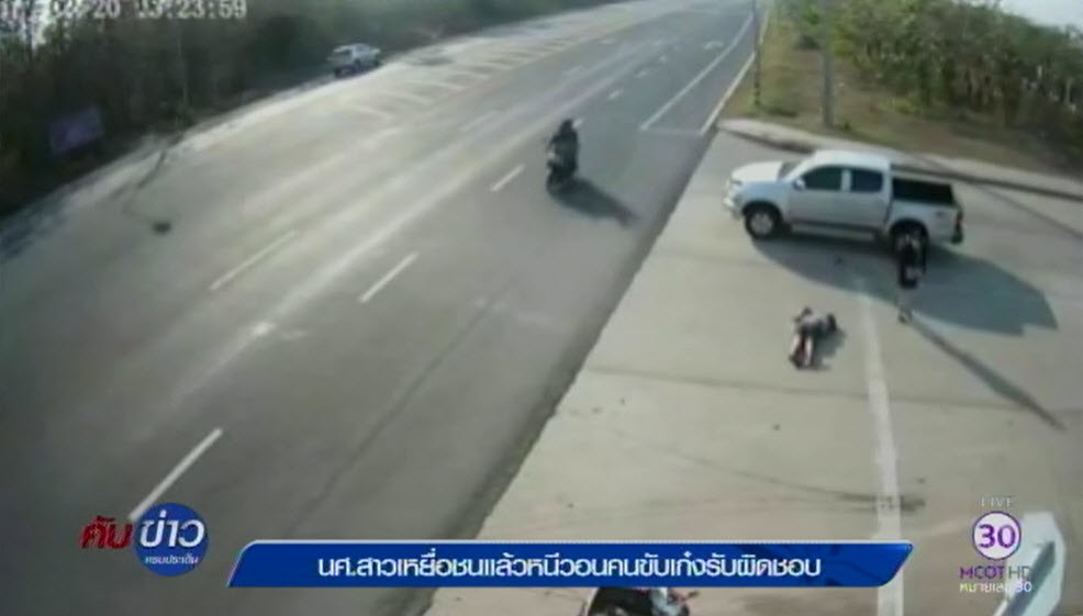บุรีรัมย์ 22 ก.พ.- นศ.สาว เหยื่อรถเก๋งเลี้ยวปาดหน้าชน จยย. หน้าศูนย์ราชการจังหวัดบุรีรัมย์ แล้วขับหนี วอนรถเก๋งออกมารับผิดชอบ
