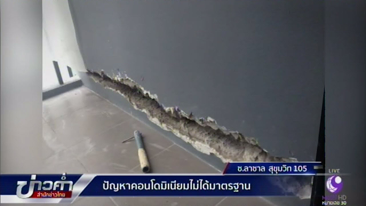 กรุงเทพฯ 22 ก.พ.-แต่ละปีมีข้อร้องเรียนการสร้างคอนโดมิเนียมไม่ได้มาตรฐาน หรือล่าช้า เข้ามาที่ สคบ.เพิ่มขึ้นทุกปี กว่าครึ่งต้องฟ้องร้อง เพราะไกล่เกลี่ยไม่ได้ ล่าสุด ลูกบ้านคอนโดฯ ชื่อดังย่านซอยลาซาล ร้องเรียนกับสำนักข่าวไทยว่า อาจมีการก่อสร้างผิดแบบ เกิดรอยร้าวมากมาย ลูกบ้านย้ายเข้าอยู่ไม่ถึงปี แต่แจ้งซ่อมแล้วเกือบ 60 ห้อง กังวลเสี่ยงเกิดอันตราย ติดตามจากรายงาน.-สำนักข่าวไทย