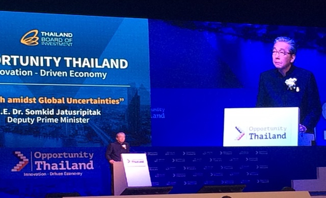นายสมคิด จาตุศรีพิทักษ์ รองนายกรัฐมนตรี ปาฐกถาพิเศษ ในหัวข้อ “การเติบโตของเศรษฐกิจไทยท่ามกลางความผันผวนเศรษฐกิจโลก” ว่า จากความผันผวนของเศรษฐกิจโลกทั้งนโยบายทรัมป์ การออกจากสหภาพยุโรป (อียู) ของอังกฤษ ความเป็นหุ้นส่วนทางเศรษฐกิจของกลุ่มเอเชีย จึงต้องร่วมมือกันเพื่อรองรับความผันผวนของกลุ่มประเทศอื่น ถักทอเป็นห่วงโซ่ใหม่ที่เข้มแข็ง รับมือการเปลี่ยนแปลงของกระแสโลกใหม่ การต่อยอดศูนย์กลางการผลิตยานยนต์ การเชื่อมโยงแหล่งท่องเที่ยวของประเทศเพื่อนบ้าน การพัฒนาทางการแพทย์ครบวงจร การพัฒนาอากาศยานเชื่อมโยงการท่องเที่ยวและลงทุน จุดแข็งของไทย คือ สถานที่ตั้งของไทย เอื้ออำนวยทุกด้าน ไทยมุ่งมั่นพัฒนาโครงสร้างพื้นฐาน ถนน รถไฟทางคู่ ไอที ท่าเรือ เทคโนโลยี สนามบิน