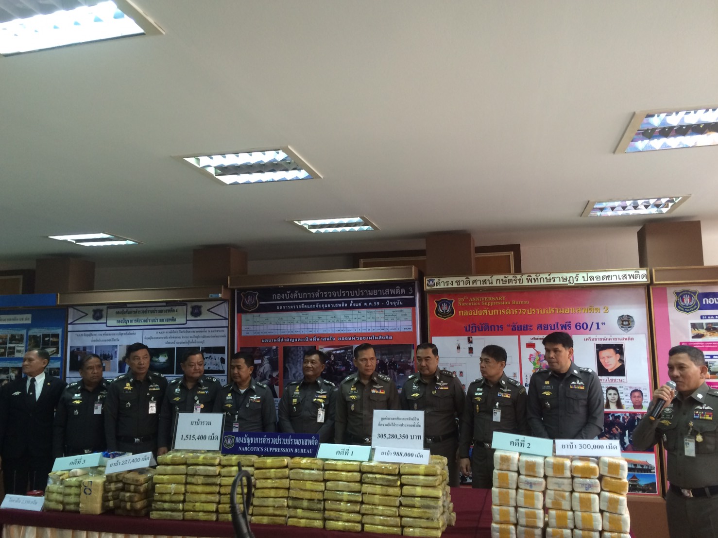 พลตำรวจเอกเฉลิมเกียรติ ศรีวรขานรองผู้บัญชาการตำรวจแห่งชาติ พร้อมด้วย พล.ต.ท.สมหมาย กองวิสัยสุข ผบช.ปส. แถลงจับกุมขบวนค้ายาเสพติดยาบ้ารวมกว่า 1 ล้าน 5 แสนเม็ด เป็นของกลางที่ตำรวจปราบปรามยาเสพติดยึดมาได้ จากการกวาดล้างขบวนการยาเสพติด 3 คดี และสามารถจับกุมผู้ต้องหาได้ 9 คน
