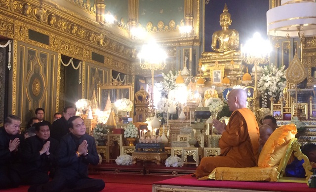 พล.อ.ประยุทธ์ จันทร์โอชา นายกรัฐมนตรี นางนราพร จันทร์โอชา ภริยา พร้อมด้วยคณะรัฐมนตรี และสมาชิกคณะรักษาความสงบแห่งชาติ (คสช.) เข้าเฝ้าถวายสักการะสมเด็จพระอริยวงศาคตญาณ สมเด็จพระสังฆราช สกลมหาสังฆปริณายก ณ พระอุโบสถ วัดราชบพิธสถิตมหาสีมาราม