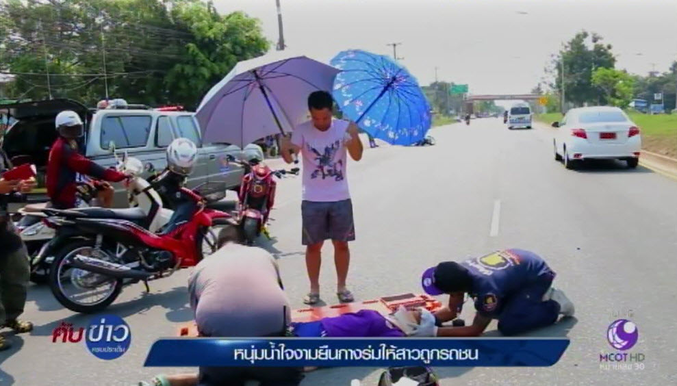 พัทยา 13 ก.พ.-หนุ่มน้ำใจงาม ยืนตากแดดกางร่มให้สาวถูกรถชนนอนบาดเจ็บกลางถนน ระหว่างรอเจ้าหน้าที่กู้ภัยมาช่วยเหลือ