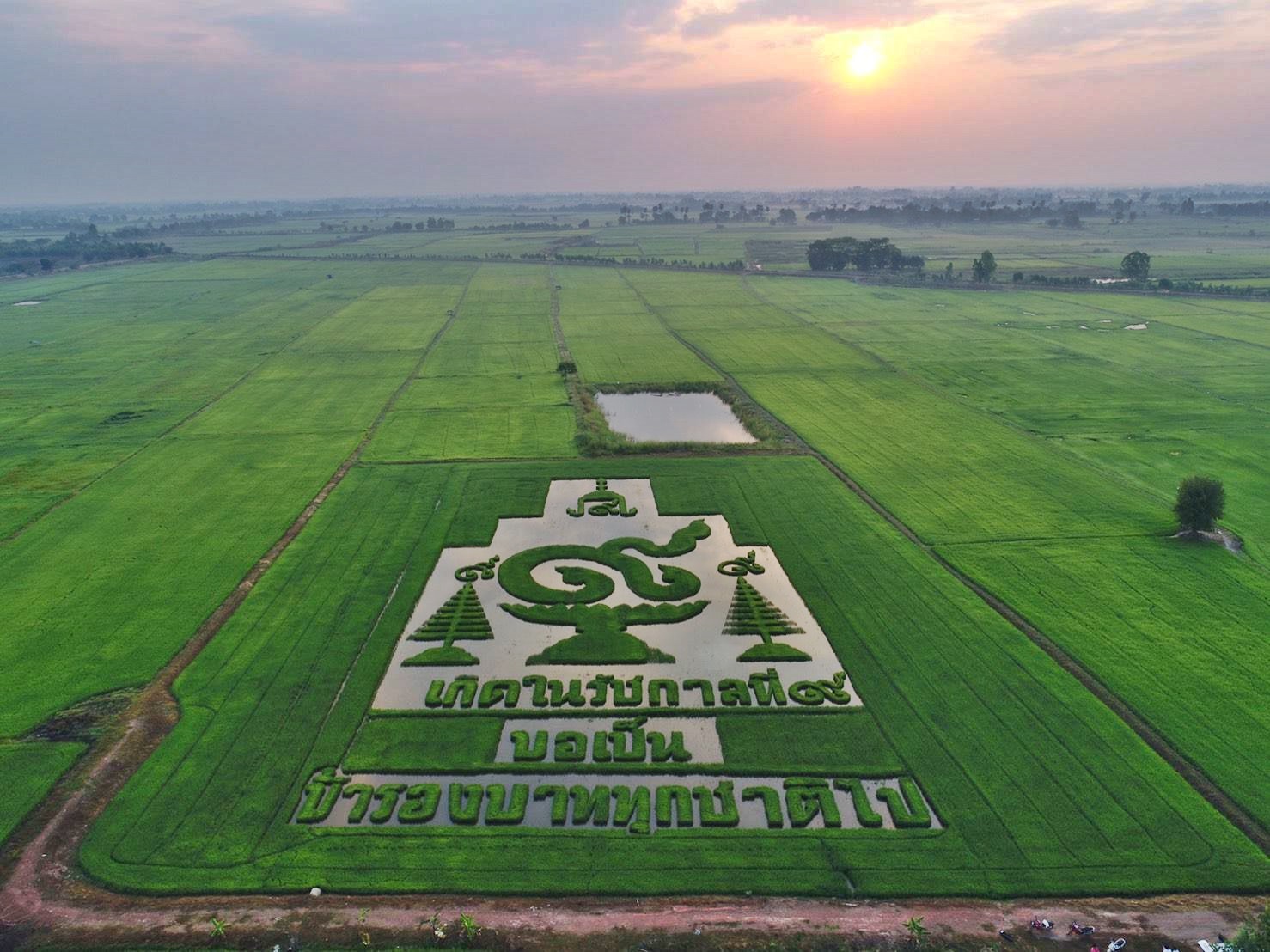 นายธวัชชัย หมวกสังข์ ชาวนา ต.ทุ่งหลวง อ.คีรีมาศ จ.สุโขทัย ตั้งใจปลูกข้าวบนพื้นที่นา 9 ไร่ ด้วยความมุ่งมั่นเพื่อถวายความจงรักภักดี โดยการออกแบบพื้นที่นา หมู่ 8 ต.ทุ่งหลวง อ.คีรีมาศ จ.สุโขทัย ให้ด้านบนเป็นชฎา มีเลข ๙ ไทยขนาดใหญ่วางบนพาน พร้อมฉัตร ๙ ชั้น สองข้างมีเลข ๙ ไทยบนยอดฉัตร และตัวอักษร “เกิดในรัชกาลที่ ๙ “ ด้านล่างเขียนว่า “ขอเป็นข้ารองบาททุกชาติไป”