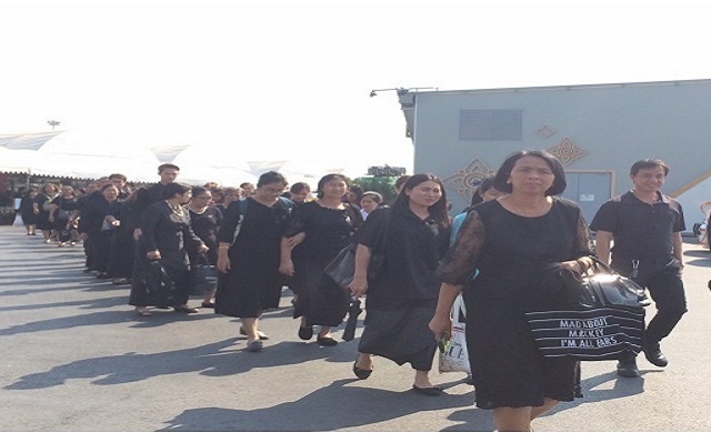 ผู้สื่อข่าวรายงาน บรรยากาศที่บริเวณท้องสนามหลวง ตลอดทั้งวันยังมีประชาชนทั้งในกรุงเทพฯ และต่างจังหวัด หลั่งไหลเดินทางเข้ากราบถวายบังคมพระบรมศพพระบาทสมเด็จพระปรมินทรมหาภูมิพลอดุลยเดชอย่างต่อเนื่อง ท่ามกลางสภาพอากาศที่ร้อนจัด ด้านงานนิทรรศการ “เย็นศิระ เพราะพระบริบาล” บริเวณ ด้านทิศเหนือของสนามหลวง ยังคงมีประชาชนให้ความสนใจเข้าชมนิทรรศการต่อเนื่อง โดยเฉพาะโซนที่ 2 ” พระราชาผู้ทรงธรรม (ทำ) ” ซึ่งเป็นโซนที่เป็นไฮไลท์ และได้รับความสนใจอย่างมาก มีการฉายวีดีทัศน์ ที่บอกเล่าเรื่องราวเกี่ยวกับพระราชกรณียกิจที่ทรงมีต่อปวงชนชาวไทยตลอดระยะเวลา 70 ปี ที่ใช้หลัก “เข้าใจ เข้าถึง พัฒนา” เพื่อสร้างความมั่นคงในชีวิต การศึกษา และอาชีพ อย่างพอเพียงและยั่งยืนให้กับพสกนิกรชาวไทย โดยระหว่างที่วีดีทัศน์กำลังฉาย ประชาชนที่เข้ารับชมต่างหลั่งน้ำตาออกมาด้วยความซาบซึ้งในพระมหากรุณาธิคุณ นอกจากนี้ ยังมีการแสดงสิ่งของเครื่องทรงงานส่วนพระองค์ อาทิ แผ่นที่ ดินสอ และฉลองพระองค์ที่ใช้ทรงงาน สมุดจดบันทึก กล้องส่องทางไกล และแซกโซโฟนที่ทรงดนตรี