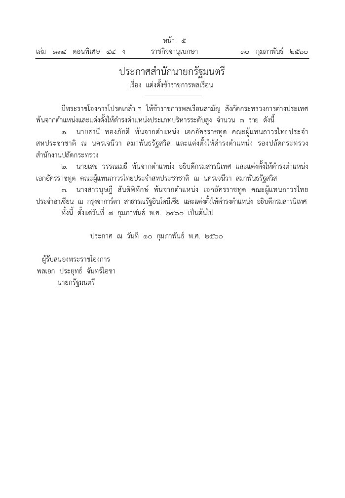 11.นายธานี ทองภักดี พ้นจากตําแหน่งเอกอัครราชทูต คณะผู้แทนถาวรไทยประจําสหประชาชาติ ณ นครเจนีวา สมาพันธรัฐสวิส และแต่งตั้งให้ดํารงตําแหน่งรองปลัดกระทรวง สํานักงานปลัดกระทรวง 12.นายเสข วรรณเมธี พ้นจากตําแหน่งอธิบดีกรมสารนิเทศ และแต่งตั้งให้ดํารงตําแหน่งเอกอัครราชทูต คณะผู้แทนถาวรไทยประจําสหประชาชาติ ณ นครเจนีวา สมาพันธรัฐสวิส 13.นางสาวบุษฎี สันติพิทักษ์ พ้นจากตําแหน่งเอกอัครราชทูต คณะผู้แทนถาวรไทยประจําอาเซียน ณ กรุงจาการ์ตา สาธารณรัฐอินโดนีเซีย และแต่งตั้งให้ดํารงตําแหน่งอธิบดีกรมสารนิเทศ