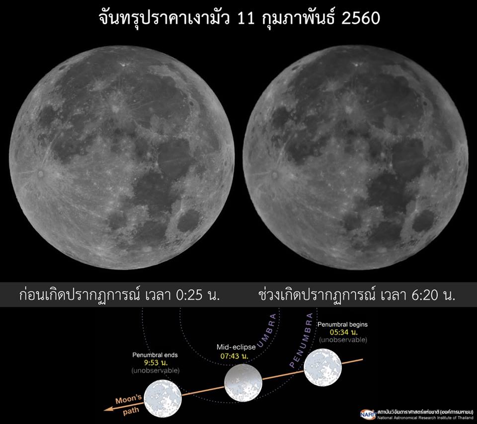 ภาพจันทรุปราคาเงามัวในเวลา 06.20 น. เปรียบเทียบกับ ภาพดวงจันทร์ก่อนเกิดปรากฏการณ์ จะเห็นได้ว่าดวงจันทร์ไม่เว้าแหว่ง ยังคงมองเห็นดวงจันทร์เต็มดวง แต่ความสว่างในส่วนที่อยู่ในเงามัวลดลงเพียงเล็กน้อยเท่านั้น