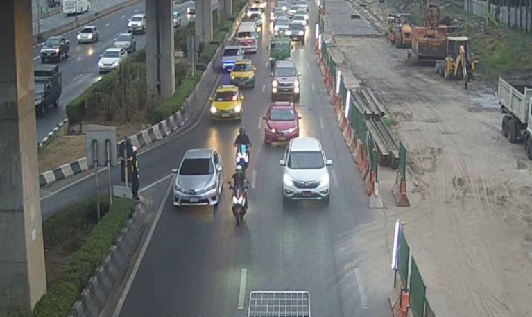 ถนนอ่อนนุช ขาเข้า จากสะพานข้ามแยกศรีนุช มุ่งหน้า ซอยสุขุมวิท71 ปริมาณรถมาก เคลื่อนตัวได้เรื่อยๆ