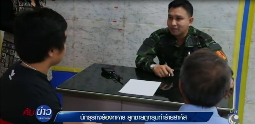 นายอนุพงษ์ กล่าวว่า เช้าวันที่ 13 พ.ย.ที่ผ่านมา ไม่เห็นลูกชายตื่นมารับประทานอาหารเช้า จึงปลุกให้ตื่น ก็เห็นลูกชายในสภาพหน้าตา ร่างกายเขียวช้ำไปทั่ว ตาปิดทั้ง 2 ข้าง สอบถามจึงรู้ว่าคืนวันที่ 12 พ.ย.ที่ผ่านมา ลูกชายพร้อมเพื่อนวัยเดียวกันรวม 4 คน เข้าไปเที่ยวที่ร้านอัพทาวน์หลังมหาวิทยาลัยขอนแก่น ถูกการ์ดและเจ้าของร้านรุมทำร้ายร่างกาย และยึดโทรศัพท์มือถือไอโฟน 7 ไป โดยบอกว่าให้หาเงิน 10,000 บาท ไปไถ่คืน จึงได้พาลูกชายเข้าแจ้งความกับพนักงานสอบสวน สภ.ย่อย มหาวิทยาลัยขอนแก่น ในวันที่ 13พ.ย.ที่ผ่านมา ซึ่งพนักงานสอบสวนได้ทำหนังสือส่งตัวเข้าตรวจร่างกายที่ รพ. ซึ่งแพทย์ลงความเห็นว่า รักษาตัวต่อเนื่อง 14 วัน แต่ไม่ได้นอนรักษาตัวรับยาไปกินที่บ้าน เวลาผ่านมาก็ไม่มีความคืบหน้า จึงเข้าร้องขอความเป็นธรรมกับทหาร เพื่อให้ประสานหน่วยงานที่เกี่ยวข้องดำเนินการเอาผิดกับบุคคลที่เกี่ยวข้องทั้งหมด