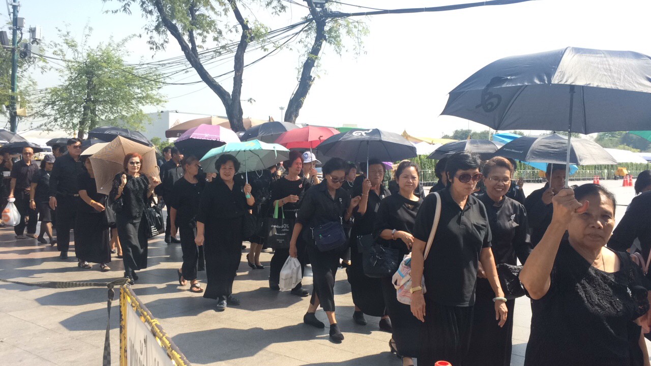 บรรยากาศที่ท้องสนามหลวงตลอดช่วงบ่าย ยังคงมีประชาชนจากทั่วทุกสารทิศเดินทางมาเข้าคิวที่เต้นท์พักรออย่างต่อเนื่องไม่ขาดสาย เพื่อรอเข้ากราบถวายบังคมพระบรมศพ พระบาทสมเด็จพระปรมินทรมหาภูมิพลอดุลยเดช ณ พระที่นั่งดุสิตมหาปราสาท ในพระบรมมหาราชวัง แม้ตลอดทั้งวันนี้จะมีแสงแดดและอากาศที่ร้อนจัด มีคณะครูและนักเรียนจากโรงเรียนบ้านโนนสวรรค์ และโรงเรียนบ้านโนนสำราญ ตำบลบ้านไร่ อำเภอเทพสถิต จังหวัดชัยภูมิ เดินทางตั้งแต่เมื่อคืนเพื่อรอเข้าถวายบังคมพระบรมศพฯ