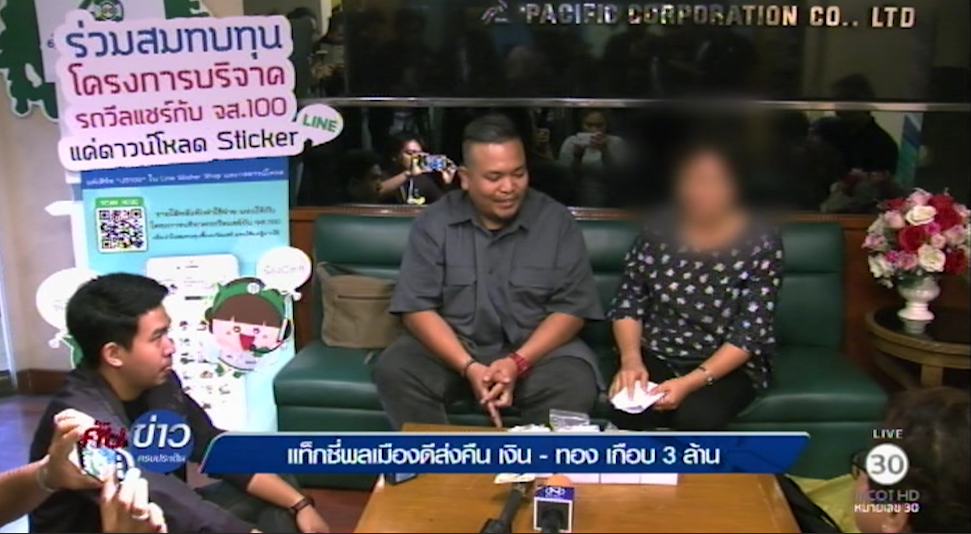 โชเฟอร์รถแท็กซี่พลเมืองดี นำทรัพย์สินประกอบด้วยทองรูปพรรณ น้ำหนักรวมกว่า 120 บาท และเงินสดอีก 3 แสนบาท มาที่สถานีวิทยุ จส.100 เพื่อคืนให้กับเจ้าของร้านทอง ในอำเภอเมือง จังหวดพิษณุโลก ที่ลืมทรัพย์สินไว้บนรถขณะเดินทางจากสถานนีขนส่งหมอชิต 2 ไปยังบริเวณท่าน้ำราชวงศ์ เหตุเกิดเมื่อกลางดึกคืนที่ผ่านมา โดยระบุว่า หลังจากนั่งรถทัวร์จากจังหวัดเพชรบูรณ์ พร้อมทองรูปพรรณ ที่จะนำมาเปลี่ยนที่ร้านทองย่านเยาวราช ช่วงกลางดึก เมื่อมาถึงสถานีขนส่งหมอชิต 2 ได้เรียกรถแท็กซี่ สีส้ม ให้ไปส่งย่านท่าน้ำราชวงศ์ แต่เมื่อถึงย่านสะพานควาย โชเฟอร์รถแท็กซี่คันดังกล่าว ขอส่งลงกลางทางเพราะไปไม่ถูกและเรียกรถแท็กซี่อีกคันให้ เมื่อรู้ตัวว่าลืมกระเป๋าไว้ แต่จำได้ว่าไม่ได้นำกระเป๋าใส่ทองลงมาจากรถคันแรก จึงแจ้งประกาศที่ จส. 100 และสวพ. 91 รวมถึงไปแจ้งความ ที่ สน.บางซื่อ ตามหารถคันดังกล่าวตลอดทั้งคืน กระทั่งเจอตัวคนขับรถคันแรกเมื่อตอนกลางวัน แต่รถคันดังกล่าวยืนยันว่าไม่มีทรัพย์สินภายในรถจนเกือบหมดหวัง กระทั่งช่วงเย็นที่ผ่านมา จส. 100 แจ้งว่า มีแท็กซี่อีกคัน เก็บทรัพย์สินไว้ได้ จึงดีใจอย่างมาก เพราะไม่คิดว่าจะได้คืนแล้ว
