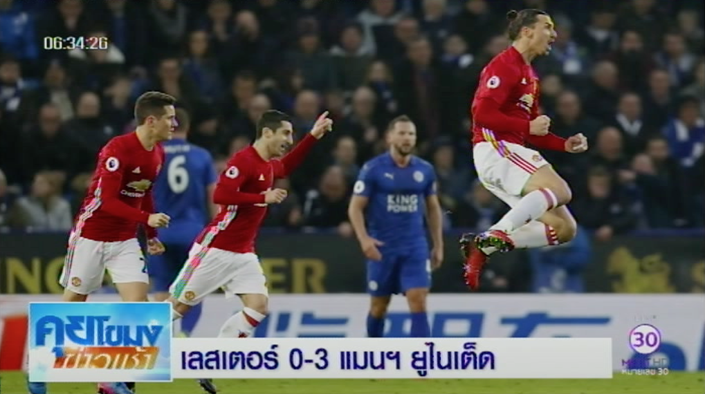 ฟุตบอลพรีเมียร์ลีก อังกฤษ เมื่อวันอาทิตย์ที่ผ่านมา เลสเตอร์ ซิตี้ ทีมแชมป์เก่า เปิดรังคิง เพาเวอร์ สเตเดียม รับการมาเยือนของแมนเชสเตอร์ ยูไนเต็ด โดยเกมนี้ “ผีแดง” ทีมเยือนมาได้ประตูนำก่อน 1-0 ในนาทีที่ 42 จากเฮนริคห์ มคิทาร์ยาน ถัดมาแค่ 2 นาที ซลาตัน อิบราฮิโมวิช ยิงให้ทีมเยือนหนีเป็น 2-0 ครึ่งหลังผ่านไปแค่ 4 นาที “ผีแดง” มาได้ประตูหนีห่างเป็น 3-0 จาก ฆวน มาตา จบเกม แมนฯ ยูไนเต็ด บุกถล่มเลสเตอร์ 3-0 เก็บเพิ่มเป็น 45 คะแนนจาก 24 นัด อยู่อันดับ 6 ส่วน เลสเตอร์ เล่น 24 นัด มี 21 คะแนน รั้งที่ 16 ของตาราง ส่วนผลอีกคู่แมนเชสเตอร์ ซิตี้ ชนะสวอนซี 2-1 เตะ 24 นัด มี 49 คะแนน รั้งอันดับ 3