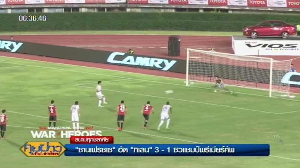 ฟุตบอล “โตโยต้า พรีเมียร์ คัพ 2016″ ที่สนามศุภชลาศัย เอสซีจี เมืองทอง ยูไนเต็ด แชมป์ไทยลีก 2016 พบกับ ซานเฟรซเซ ฮิโรชิมา อดีตแชมป์ฟุตบอลเจลีกของญี่ปุ่น 3 สมัย ครึ่งแรก เสมอกันอยู่ 0-0 เข้าสู่ครึ่งหลัง ฮิโรชิมา ได้ประตูนำ 1-0 จากการยิงของ มาซาโตะ คุโดะ นาทีที่ 57 จากนั้นอีก 5 นาที คุโดะ คนเดิมยิงอีกลูกให้ทีมเยือนหนีเป็น 2-0 นาทีที่ 64 เฟลิเป ซิลวา จะมายิงจุดโทษให้ ซานเฟรซเซ นำห่าง 3-0 จากนั้น “กิเลนผยอง” บุกหนัก นาทีที่ 86 ธีรศิลป์ แดงดา หลุดเดี่ยวเข้าไปยิงตีไข่แตกไล่มาเป็น 1-3 จบเกม ซานเฟรซเซ ฮิโรชิมา บุกมาชนะ เมืองทอง ไป 3-1 คว้าแชมป์ พร้อมเงินรางวัล 1 ล้านบาท ส่วน เมืองทอง รองแชมป์ รับไป 500,000 บาท. -สำนักข่าวไทย