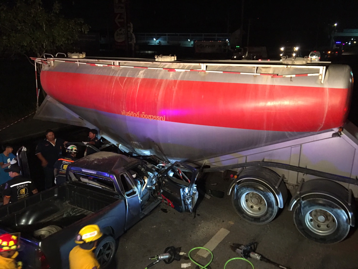 ระยอง 4 ก.พ.-รถกระบะเบรคไม่อยู่ ชนอัดก๊อปปี้กลางลำรถเทรลเลอร์ที่เลี้ยวกลับรถในระยะกระชั้นชิด เป็นเหตุให้คนในรถกระบะเสียชีวิตคาที่ รวม 3 ศพ