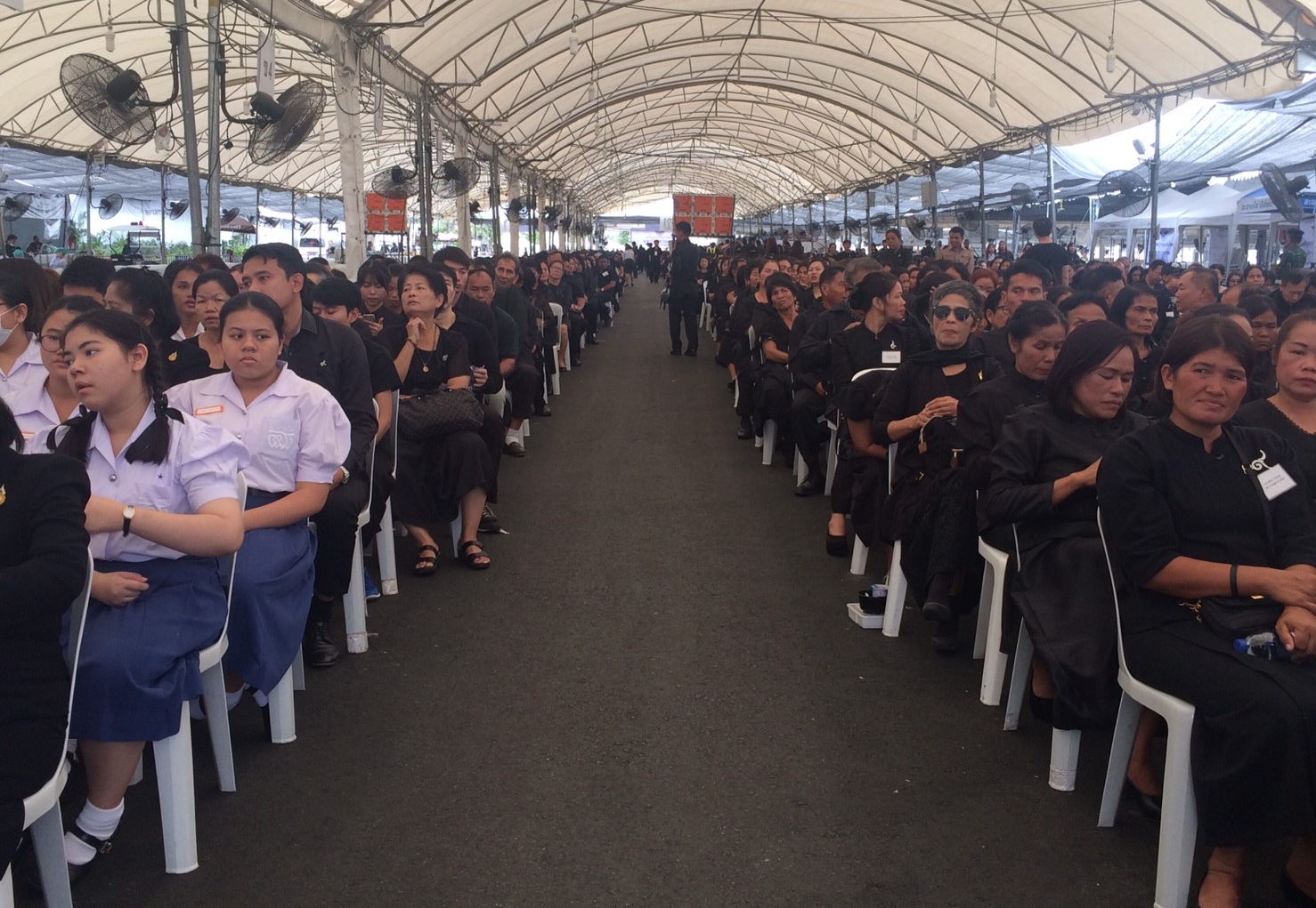 บรรยากาศที่ท้องสนามหลวงตลอดช่วงเช้าวันนี้ ประชาชนจากทั่วทุกสารทิศยังคงหลั่งไหลมาเข้าแถวเพื่อรอเข้ากราบถวายบังคมพระบรมศพพระบาทสมเด็จพระปรมินทรมหาภูมิพลอดุลยเดชอย่างต่อเนื่อง อาทิ สมาชิกชมรม อสม.ตำบลหมูม่น อ.สมเด็จ จ.กาฬสินธุ์ นักเรียนจากโรงเรียนราชินีบน และประชาชนทั่วไป ท่ามกลางจิตอาสาและเจ้าหน้าที่ทหาร ตำรวจที่คอยอำนวยความสะดวกอย่างใกล้ชิด ทำให้การรอคิวเป็นไปด้วยความเรียบร้อย