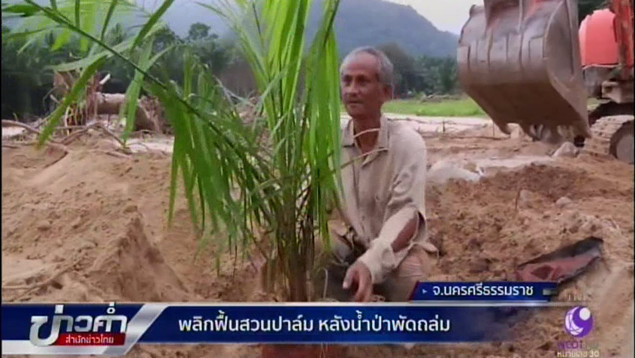 นครศรีธรรมราช 2 ก.พ.-อุทกภัยน้ำท่วมในภาคใต้สร้างความเสียหายให้พื้นที่ทางการเกษตร โดยเฉพาะสวนปาล์มน้ำมันหลายหมื่นไร่ แต่ผู้ประสบภัยรายหนึ่งในจังหวัดนครศรีธรรมราชกลับไม่ท้อ และปลูกปาล์มน้ำมันใหม่อีกครั้ง