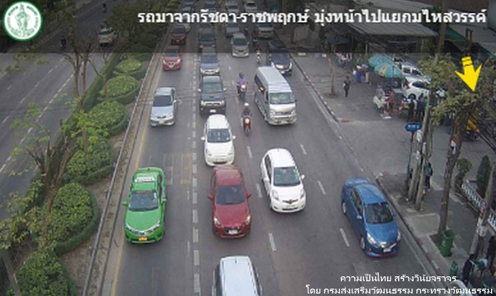 สภาพการจราจร ถนนวิภาวดีรังสิต ขาเข้า จากแยกสุทธิสาร มุ่งหน้าใต้ด่วนดินแดง ช่องคู่ขนานรถมาก ท้ายสะสมหน้าวิทยาลัยป้องกันราชอาณาจักร